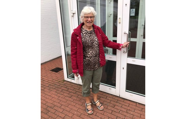 Foto: Lis Jensen står klar ved døren og tager imod.