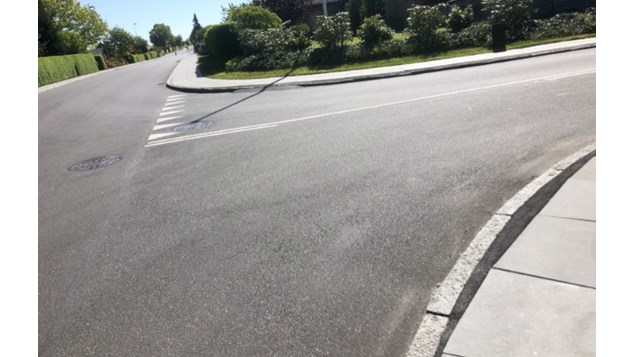 Ved T-krydset fra Sabro Kirkevej til Sabro Skolevej er der en fin op- og nedkørsel til fortovet.