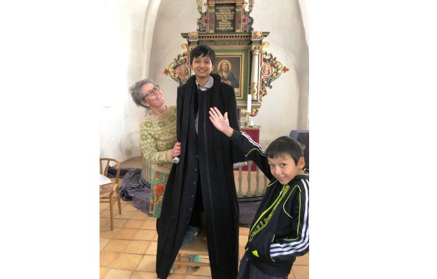 Foto: de unge mennesker prøver præstekjolen