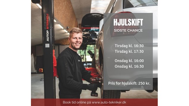 Autotekniker v/Kim Skytthe har sidste chance for at booke tid til hjulskift aften med fire ledige tider tilbage på tirsdag og onsdag. Det er en god mulighed for at få skiftet til vinterhjul i tide til de kolde veje. For mere information kan du læse det oprindelige opslag.