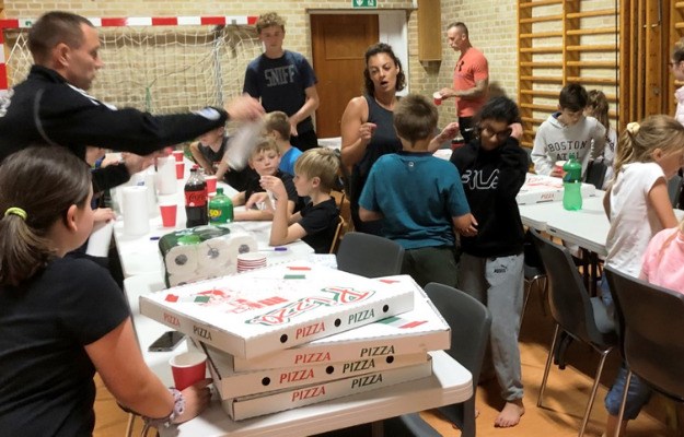 Endnu engang var det Allan Rostgaard, der tog hånd om ikke bare de unge i Sabro, men også børnene. Stemningen var høj, da der blev delt pizzaer rundt, sponseret af Sabro Pizzaria.